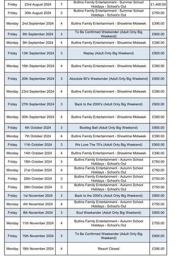 Breaks are available from £350 (for Showtime Tots 4 night break), £900 for the adults only Big Weekends and £1400 (peak season summer holiday 7 night breaks). Refer to the current year's price list in the images for exact prices. Each quoted price includes up to 4 passes into Butlins, including the Big Weekends breaks.